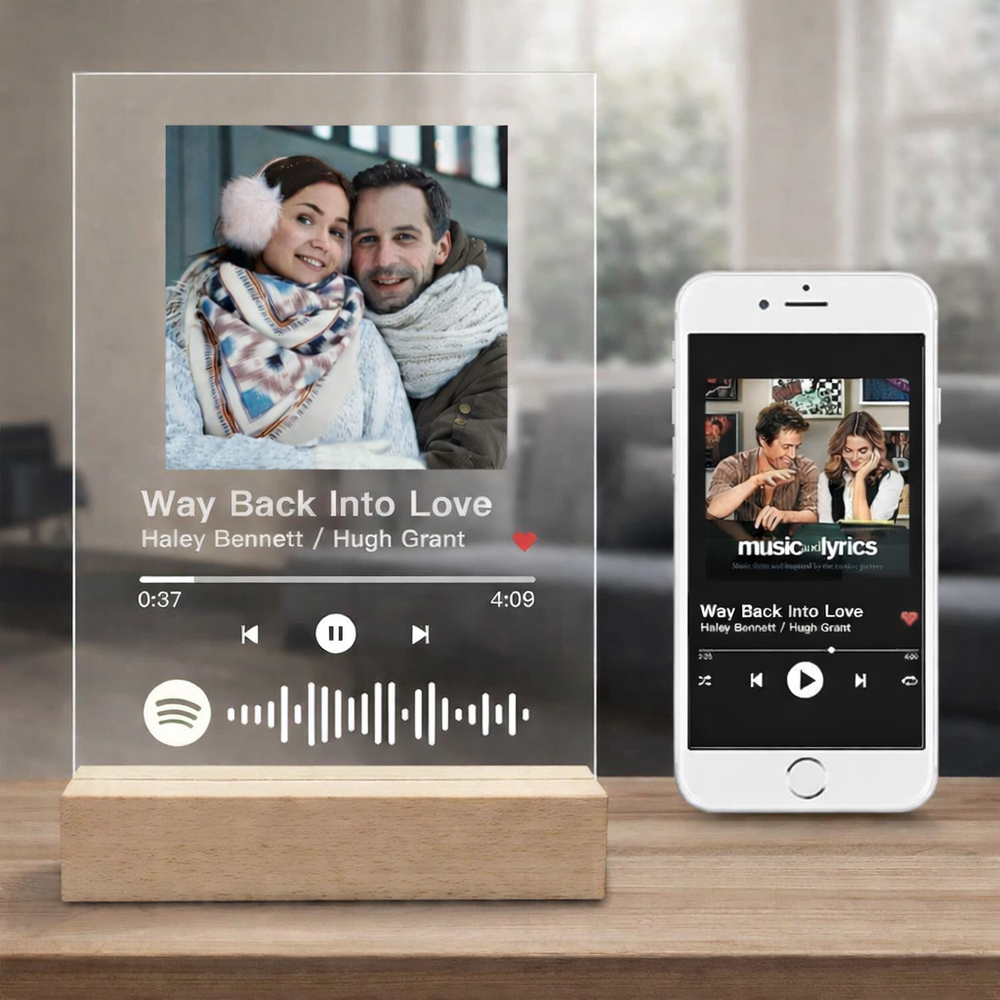 Spotify lampan kombinerar personligt foto och din egen musiksmak på en stilren LED-skiva. Kombinationen av bild och låt blir ett känslofyllt konstverk till hemmet.